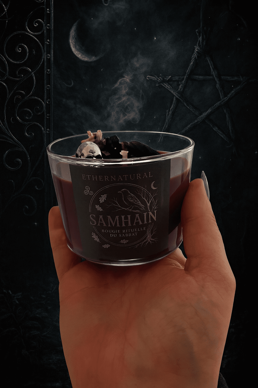Chaque bougie est fabriquée artisanalement, dans une intention de respect, de protection et de reliance aux énergies de Samhain.