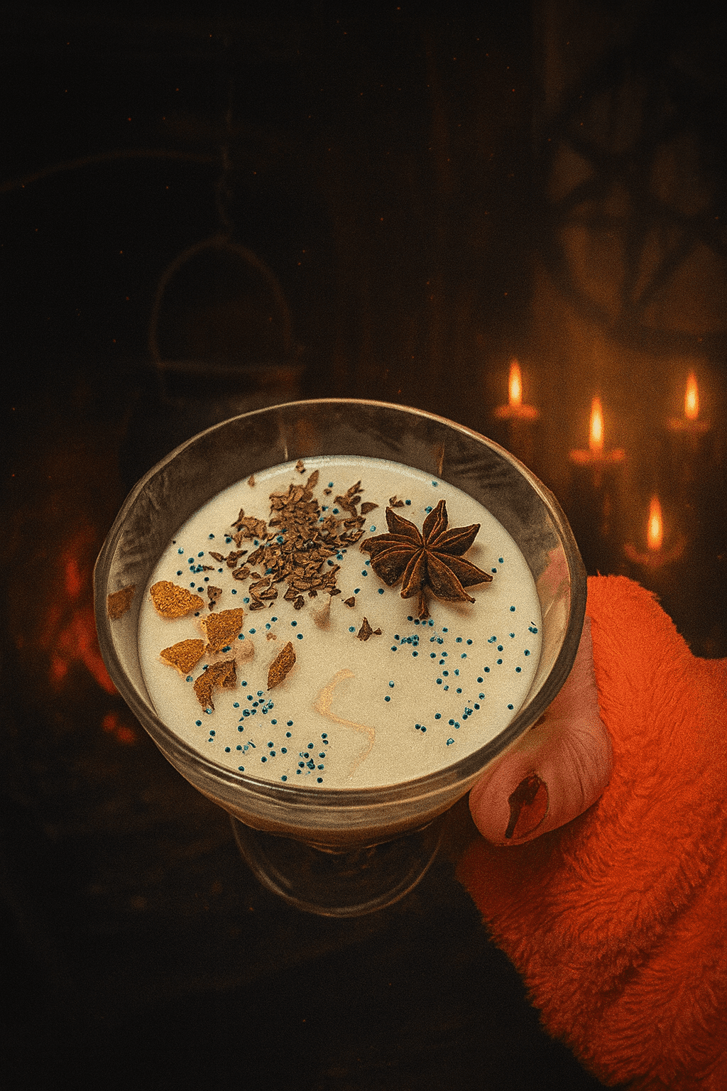 Coulée dans un élégant contenant transparent, elle est ornée d’écorces d’agrumes séchées, d’anis étoilé et de copeaux naturels, symboles d’abondance, de purification et d’espoir. Les éclats bleutés rappellent l’étincelle de la lumière qui revient, même au cœur de la nuit la plus longue.