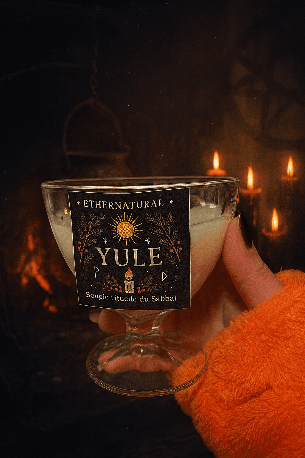 Bougie rituelle Yule infusée de plantes, épices et éclats d’agrumes, créée pour célébrer le renouveau et la lumière du Sabbat. Parfaite pour ouvrir un espace sacré, attirer chaleur, protection et énergie magique hivernale.